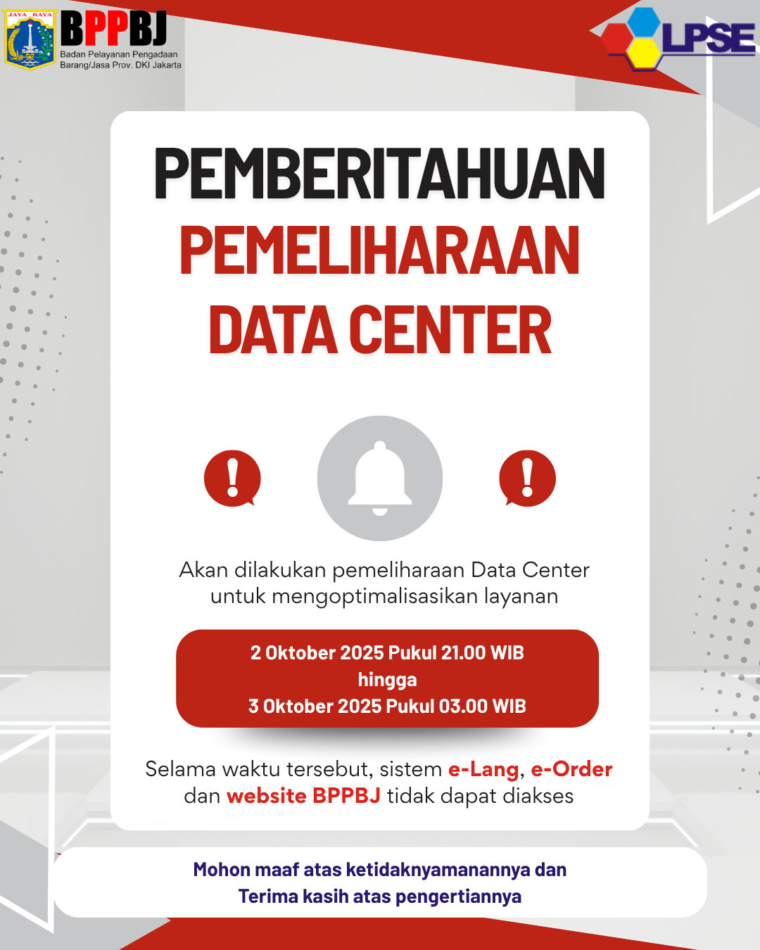 Dalam rangka pemeliharaan Data Center untuk mengoptimalisasikan layanan, sesuai Surat Kepala Dinas Komunikasi, Informatika dan Statistik Provinsi DKI Jakarta Nomor e-1733/KI.03.01 hal Pemberitahuan Pemeliharaan dan Optimalisasi Perangkat Jaringan Data Center sehingga mengakibatkan sistem e-Lang, e-Order, dan website BPPBJ tidak dapat diakses pada 2 Oktober 2025 Pukul 21.00 WIB sampai 3 Oktober 2025 Pukul 03.00 WIB
